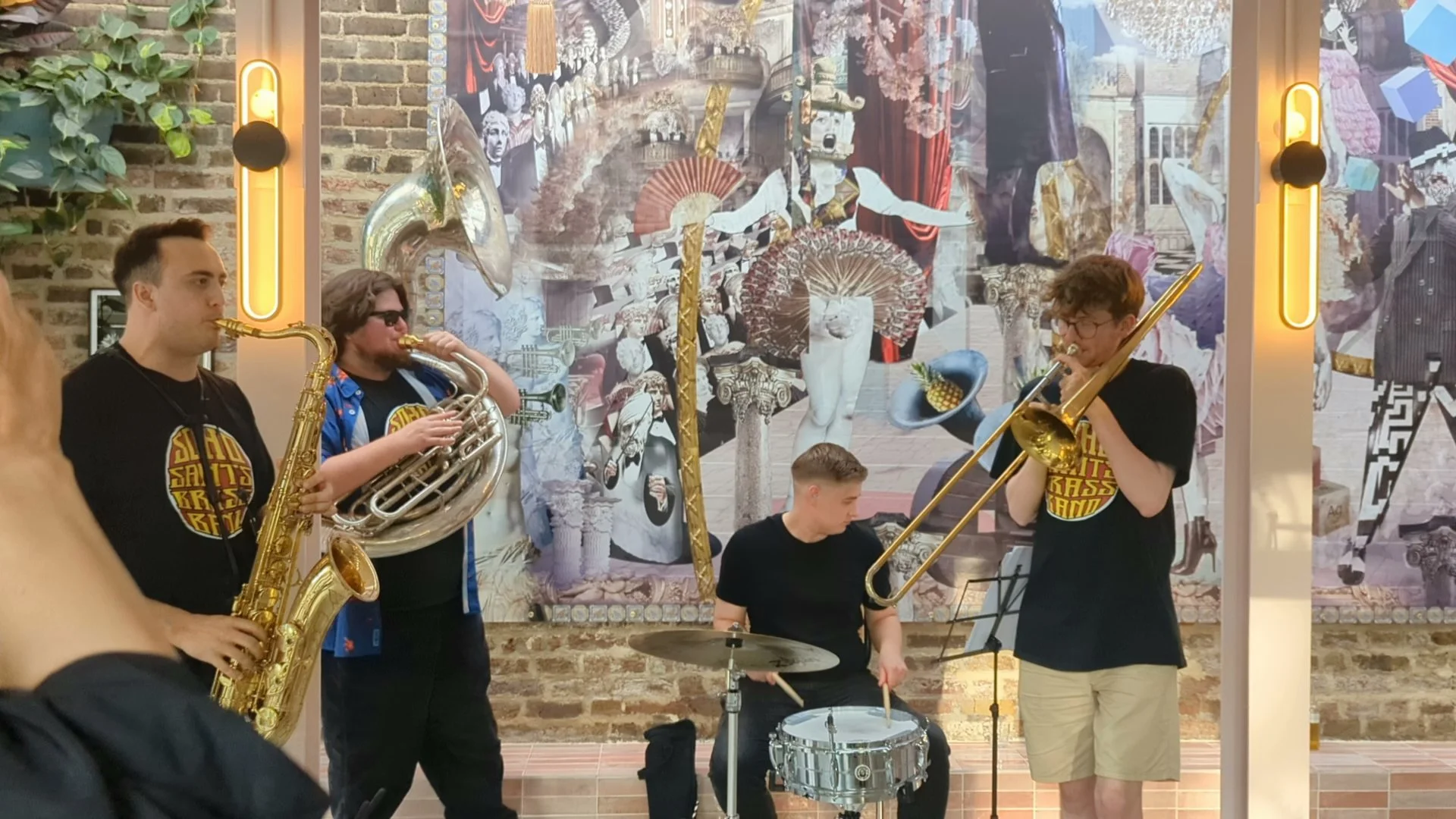 Alongside the large wall hangings are works on acrylic, depicting patrons in their boxes